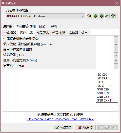 选择 "代码生成" 子选项卡中的 "语言标准(-std)" 选项标签。