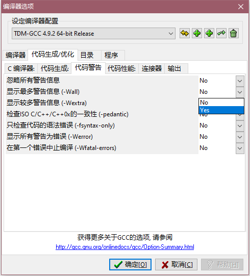 选择 "代码警告" 子选项卡中的 "显示最多警告信息(-Wall)" 选项标签。